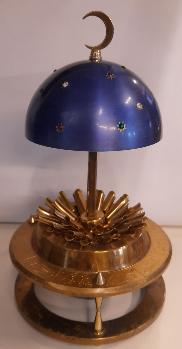 Suhteellisen harvinainen maapallon muotoinen savuketeline. Ylemmässä messinkirenkaassa kuvioituna horoskooppimerkit.